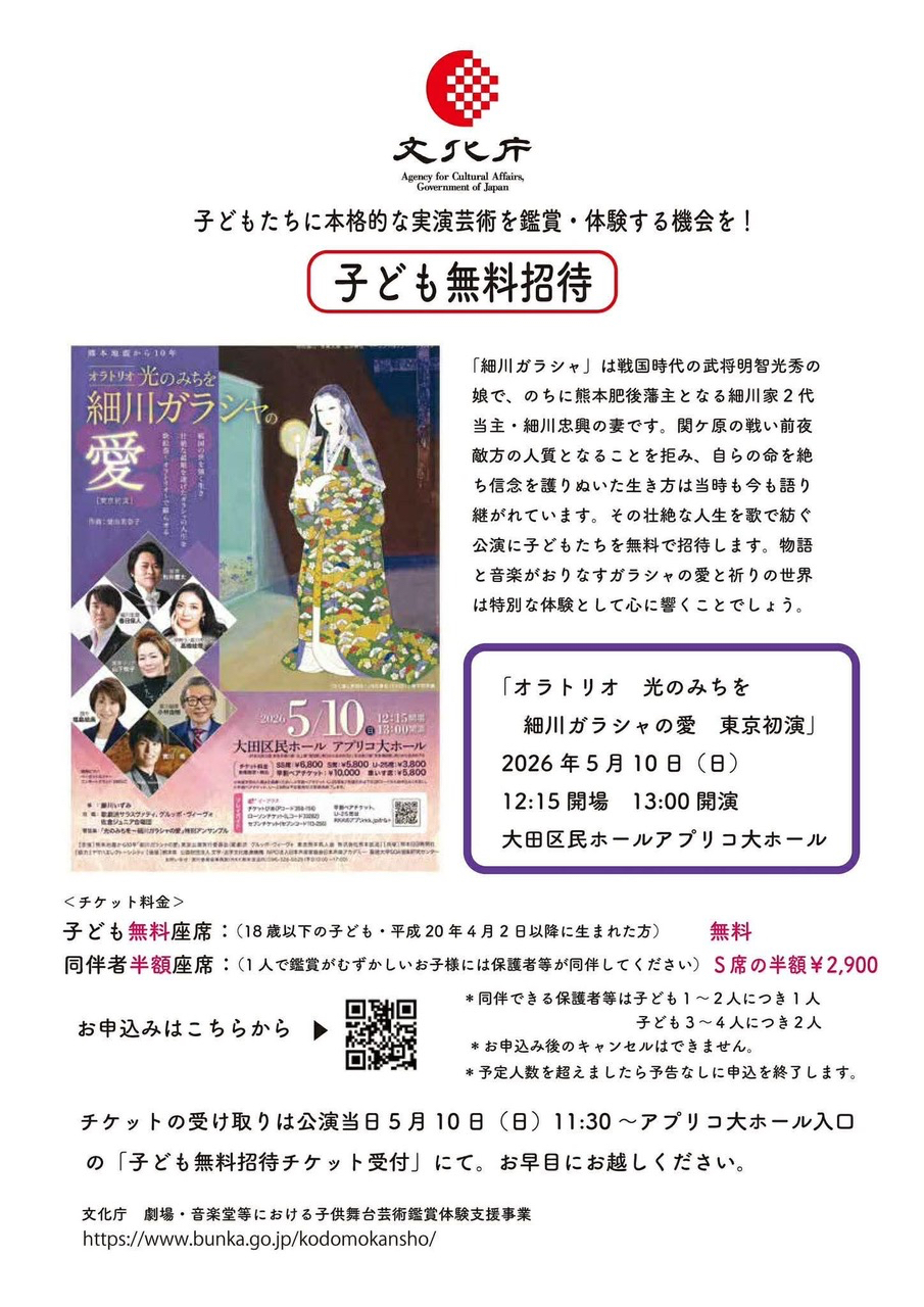 「細川ガラシャ」は戦国時代の武将明智光秀の娘で、のちに熊本肥後藩主となる細川家2代当主・細川忠興の妻です。関ヶ原の戦い前夜敵方の人質になることを拒み、自らの命を断ち信念を護りぬいた生き方は当時も今も語り継がれています。その壮絶な人生を歌で紡ぐ公演に子どもたちを無料で招待します。物語と音楽がおりなすガラシャの愛と祈りの世界は特別な体験として心に響くことでしょう。