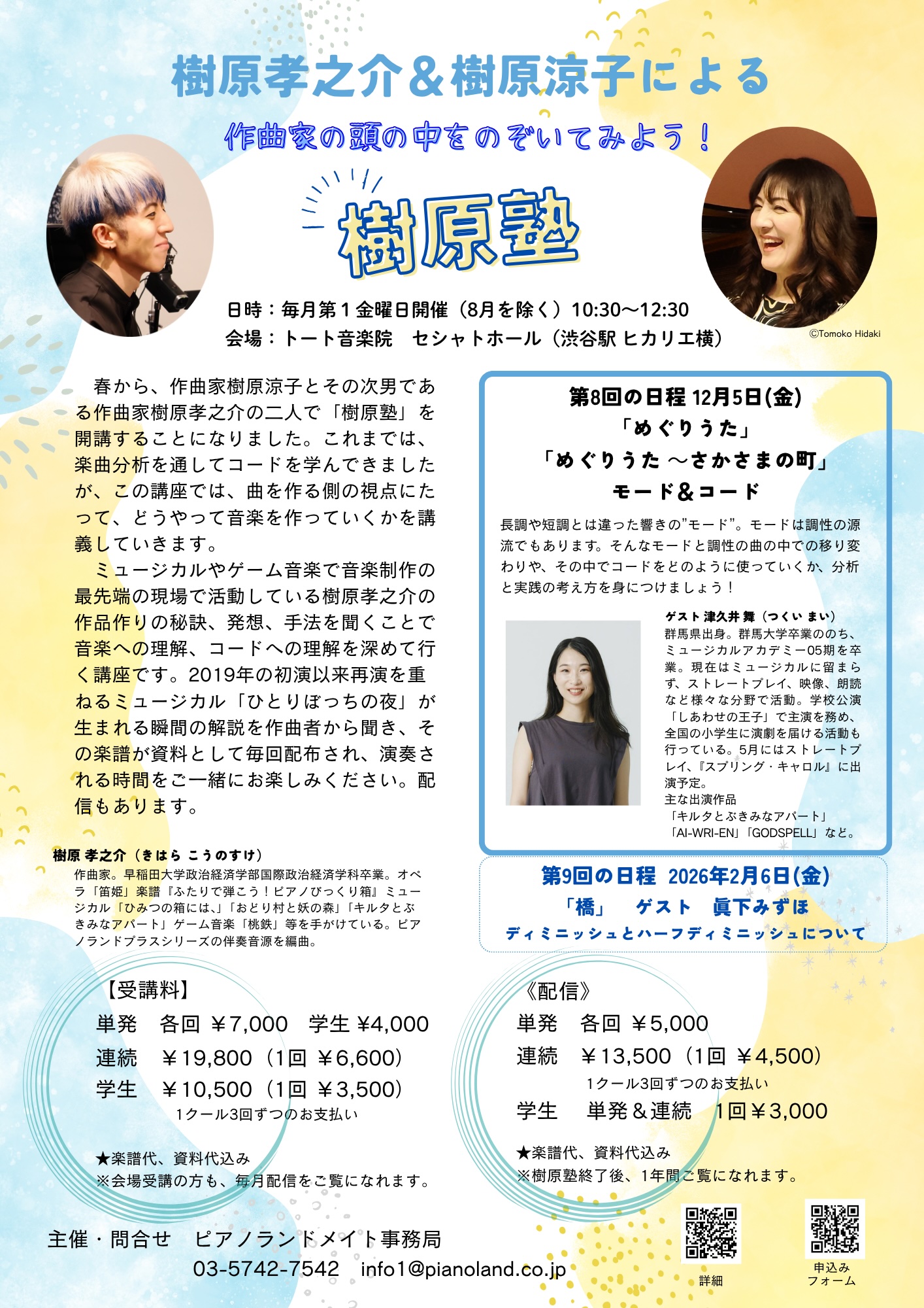 これまで開催してきた「マスタークラスⅡ」に替わる講座として、作曲家樹原涼子と樹原孝之介二人による新たな「樹原塾」をスタートすることにしました。